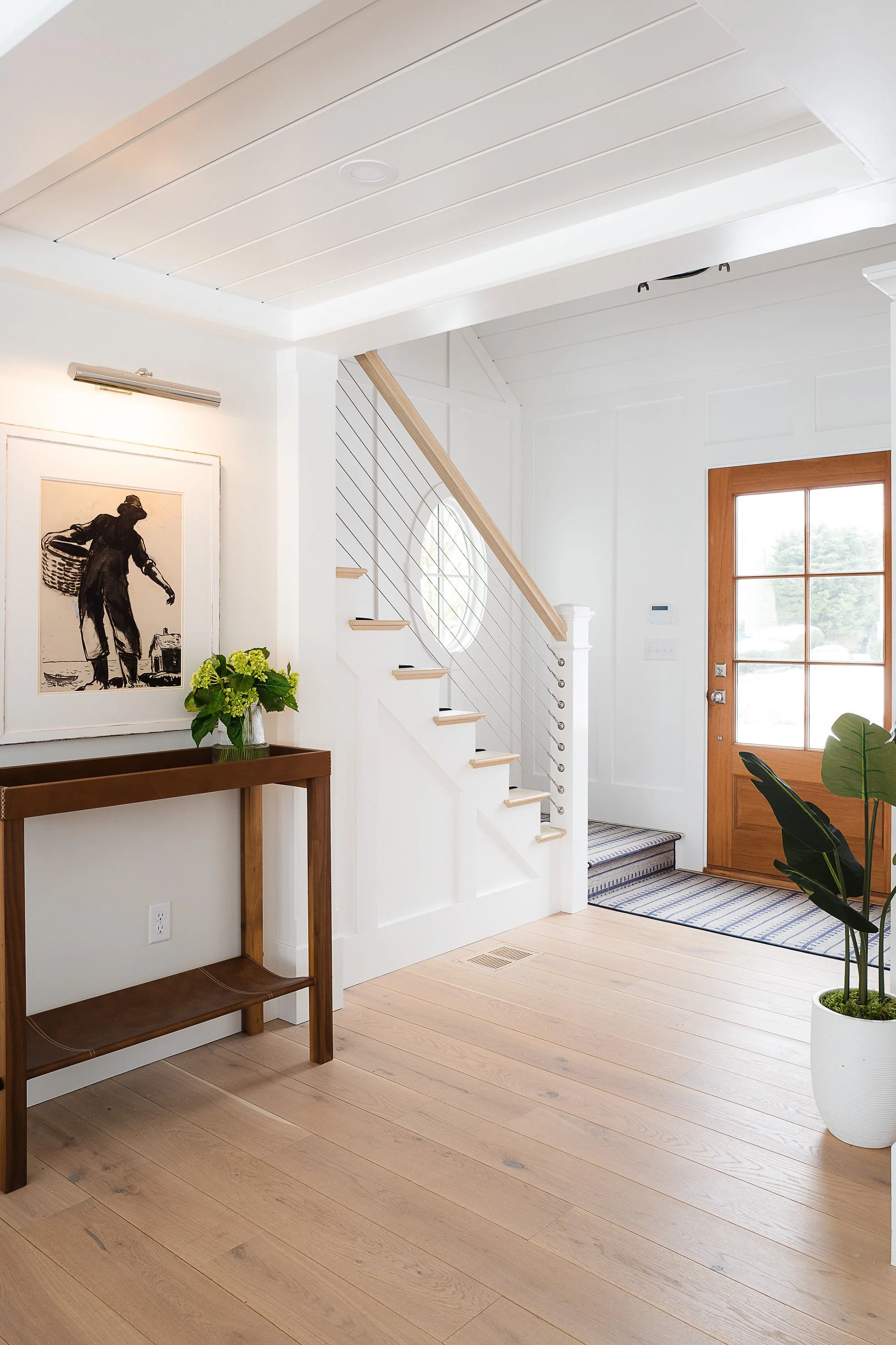 Hardwood floor installation in a Cohasset entryway with a wooden front door, white walls, cable-railed staircase, console table with green flowers, striped rug, and a large potted plant.